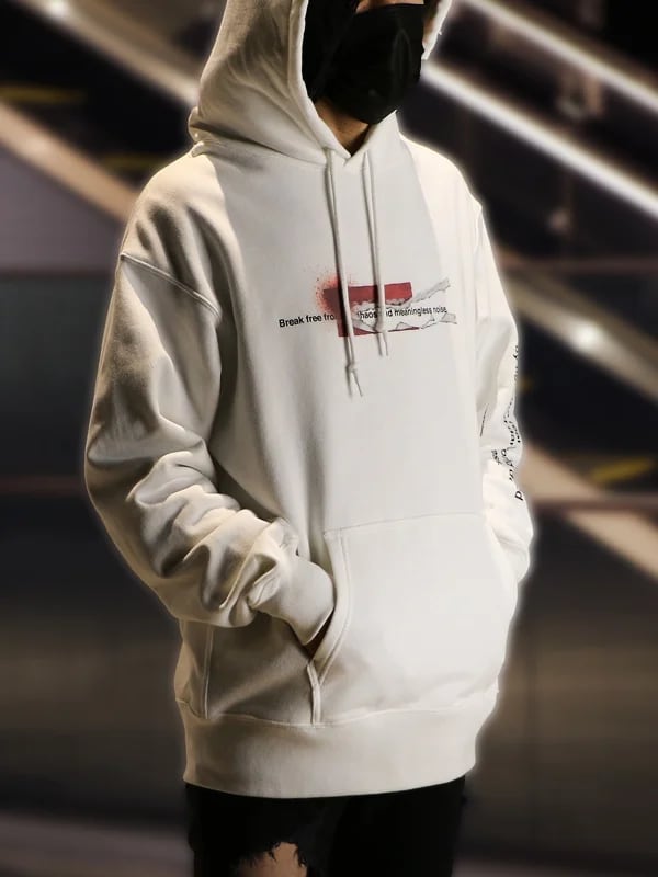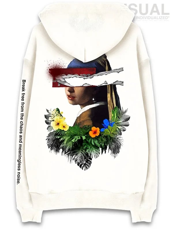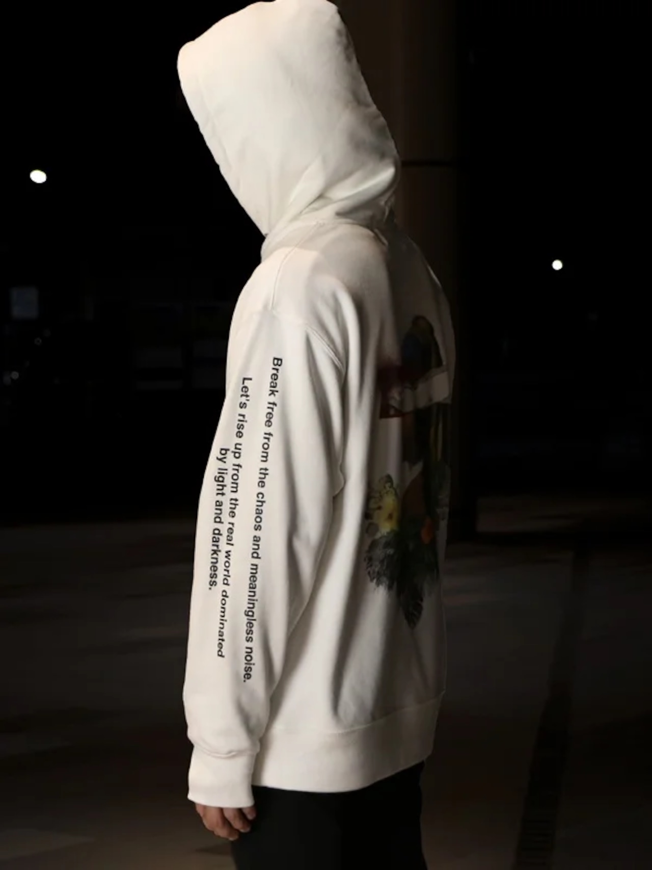 ◯その他、左脇下・左袖、フード部はボディと同色系のホワイト色を採用し細部までにインクとグラフィック、タイポグラフィに拘った工程となっています。