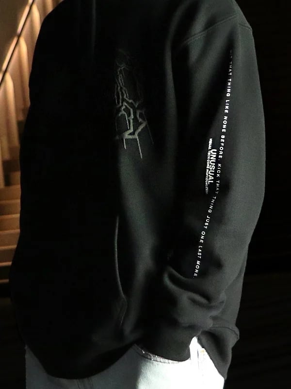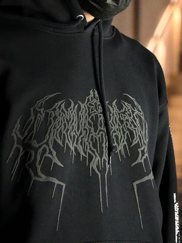 ◯左袖、左脇下、フード部はブラックのメタリックプリントを採用し細部までにインクとグラフィック、タイポグラフィに拘った工程となっています。